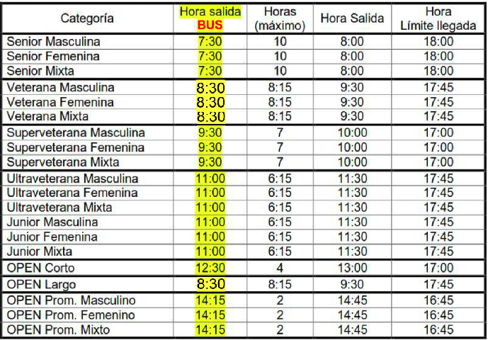 La revisión del material obligatorio se hará antes de la subida al autobús. La salida de los buses con los participantes será 30 minutos antes de la hora marcada para el inicio de la carrera.